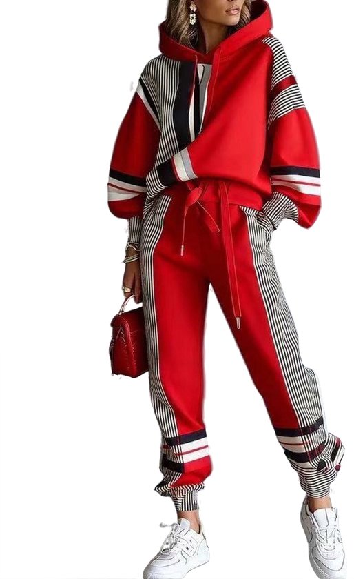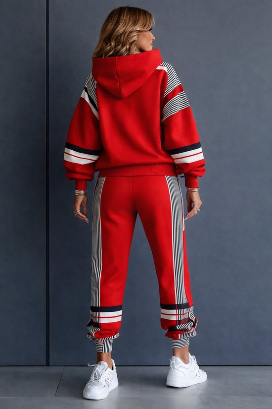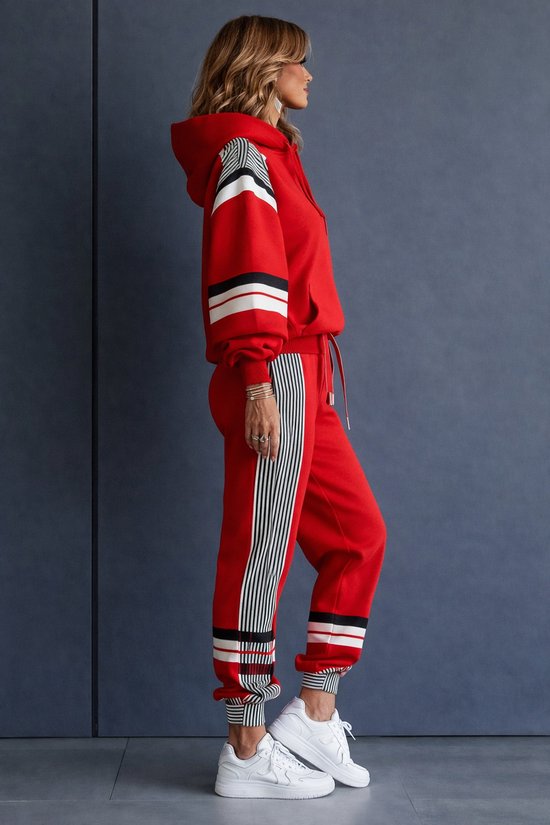 Op zoek naar een comfortabele én stijlvolle outfit voor dagelijks gebruik? Deze moderne tweedelige set bestaat uit een hoodie en een bijpassende joggingbroek in een opvallende rode kleur. Dankzij het unieke design met contrasterende strepen straal je moeiteloos een sportieve en trendy look uit, of je nu thuis ontspant of onderweg bent.