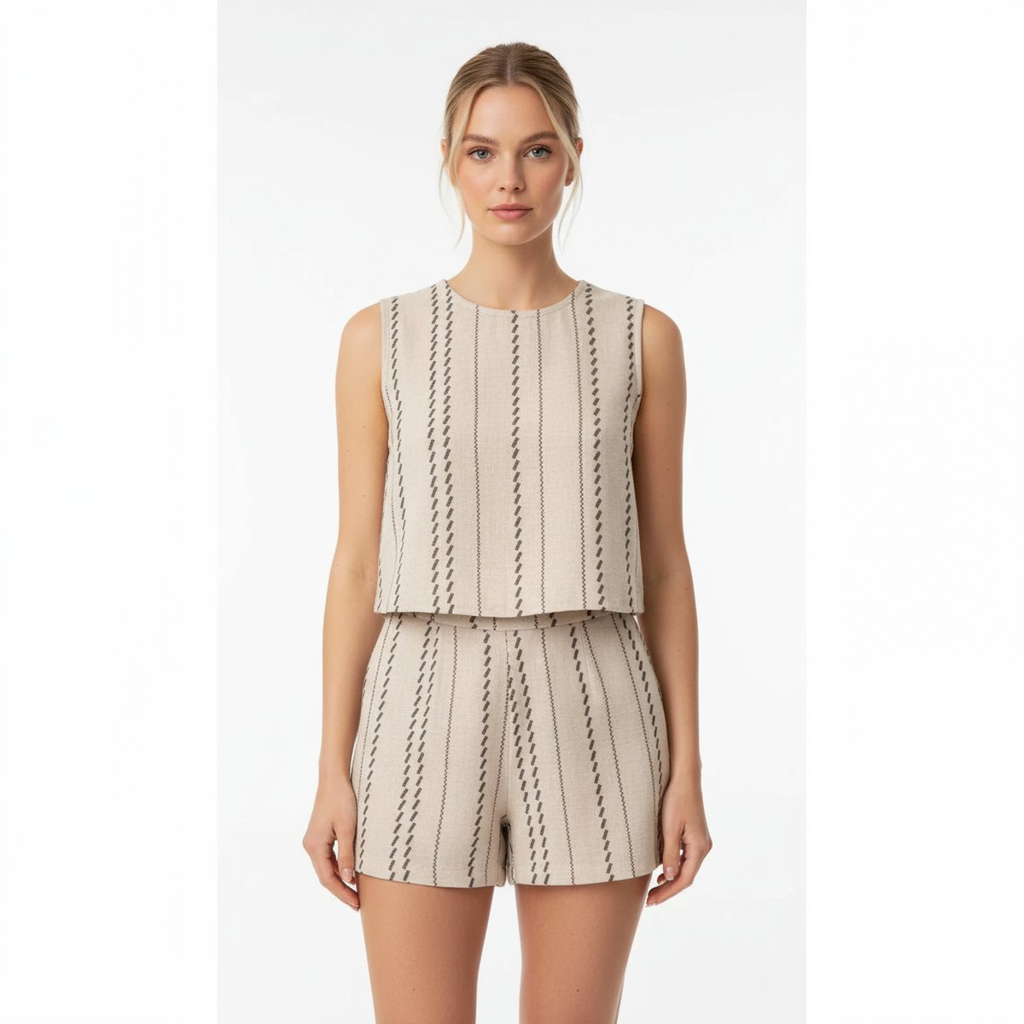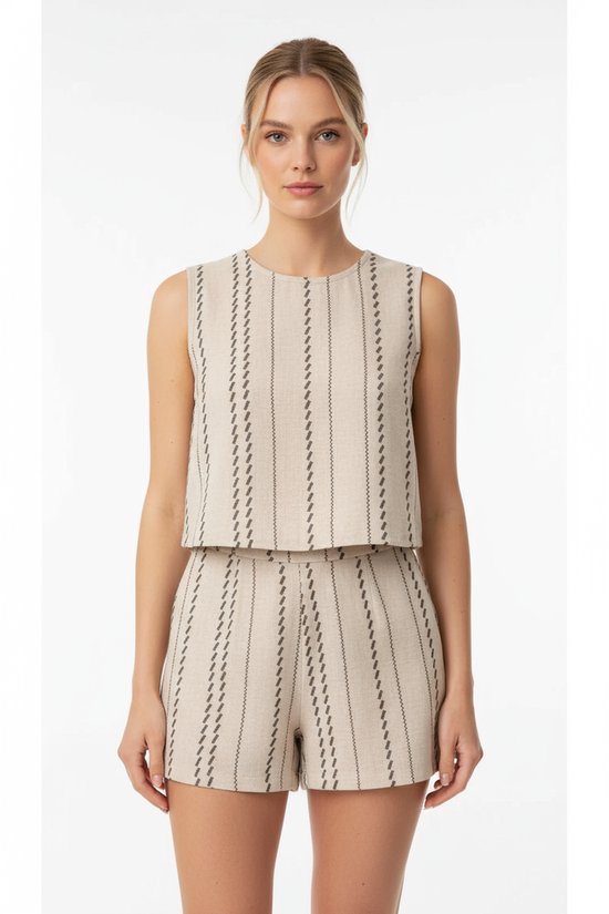 Deze dames kledingset is een stijlvol 2-delig geheel met een mouwloos shirt en een korte broek.De luchtige stof zorgt voor optimaal draagcomfort tijdens warme dagen.Perfect als zomerse outfit of voor een ontspannen vakantie look.De moderne streepdetails geven de set een trendy uitstraling.Eenvoudig te combineren met sandalen of sneakers voor een casual stijl.Een veelzijdige keuze voor modebewuste vrouwen die graag comfortabel én elegant gekleed gaan.