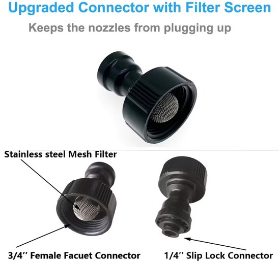 Geschikt voor diverse toepassingen zoals tuinverkoeling, plantenverneveling, terrasgebruik en meer. Inclusief alle benodigde accessoires voor een complete installatie.