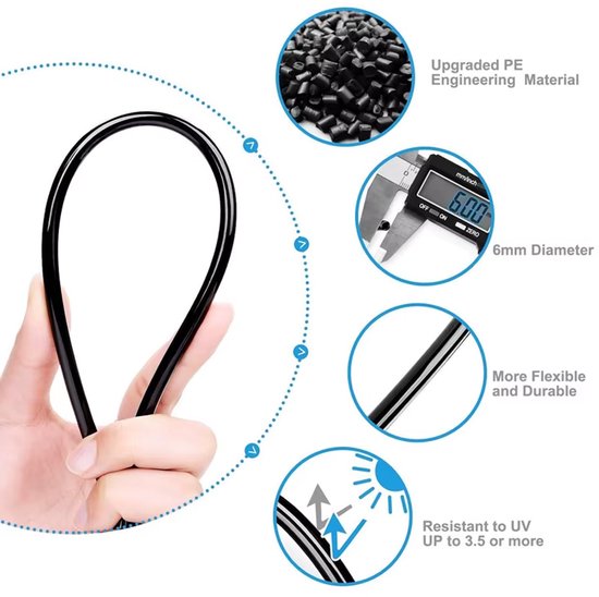 De set is voorzien van hoogwaardige messing sproeiers met een fijne 0,4 mm opening, waardoor een gelijkmatige en effectieve verneveling ontstaat. De flexibele slang is gemaakt van duurzaam en UV-bestendig materiaal, waardoor deze bestand is tegen zonlicht en langdurig gebruik.