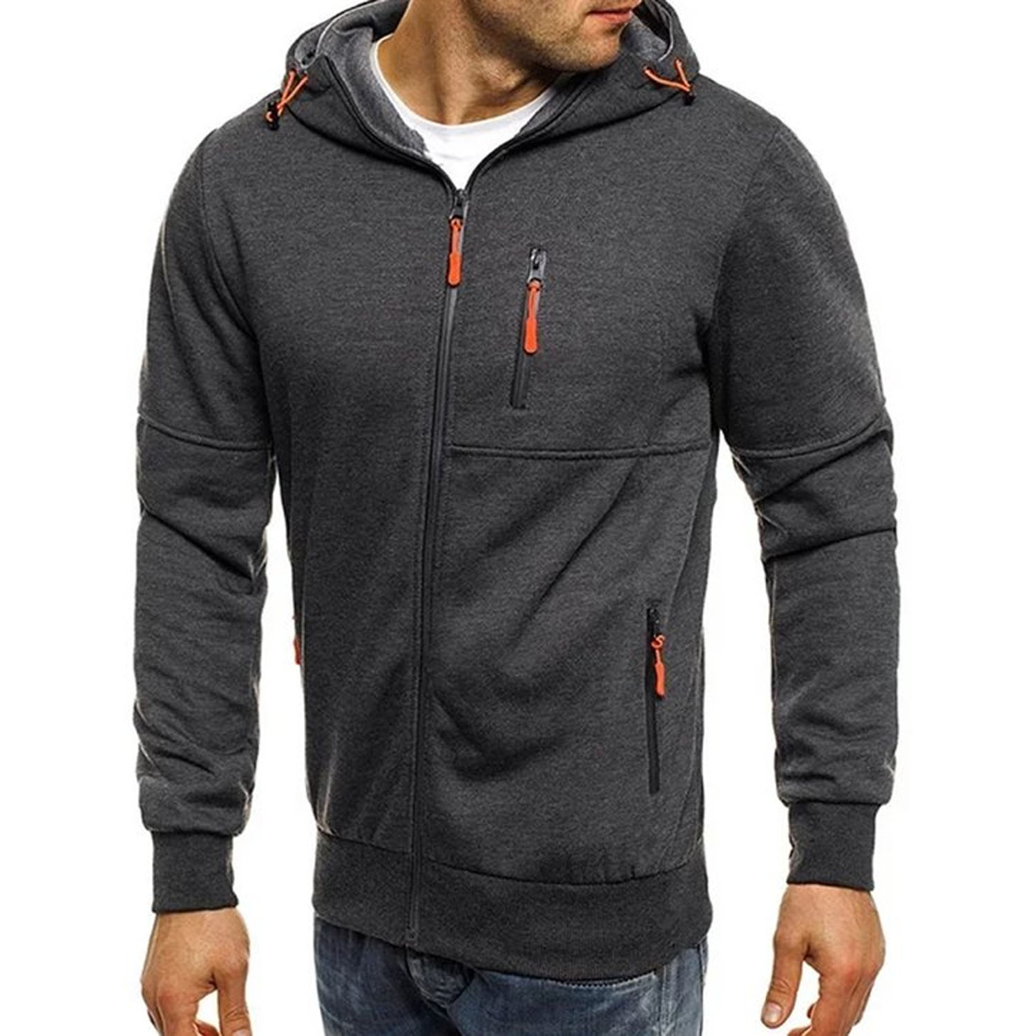 Deze donkergrijze heren hoodie heeft een sportief en strak design. Hij is voorzien van een comfortabele capuchon met oranje trekkoorden. De hoodie sluit met een stevige rits aan de voorkant. Er zitten meerdere zakken met ritssluiting, ideaal voor je sleutels of telefoon. De stof voelt zacht aan en houdt je warm tijdens frisse dagen. Perfect voor casual outfits, werk of outdoor activiteiten.