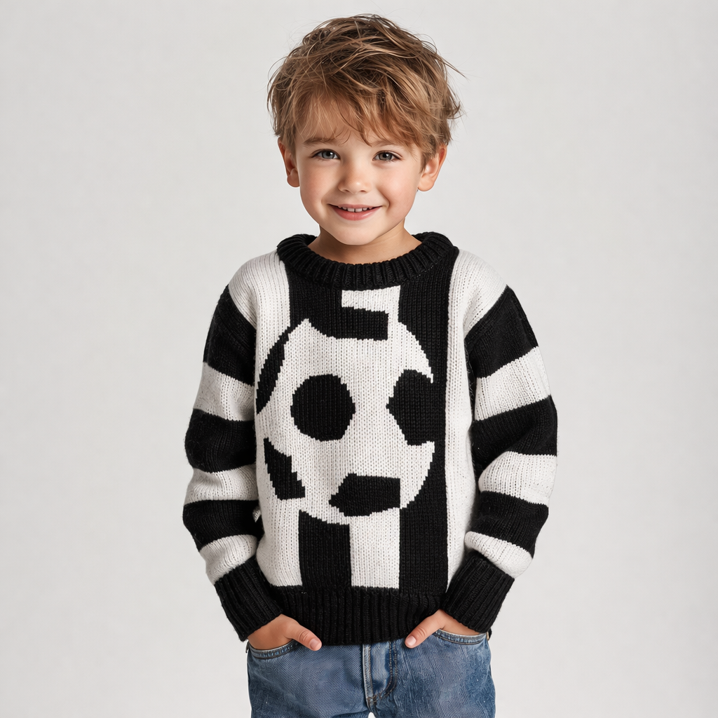 Hij heeft brede zwart-witte verticale strepen.Op de voorkant staat een groot voetbalmotief.De mouwen hebben horizontale strepen voor extra speelsheid.De ronde hals en ribboorden zorgen voor comfort.Gemaakt van zachte stof, perfect voor sportieve en actieve kinderen.