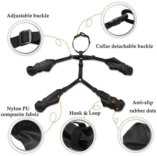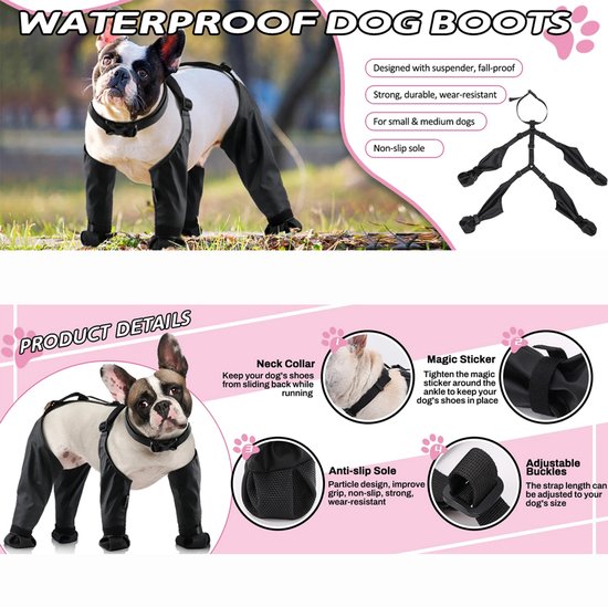 Deze waterdichte hondenschoenen beschermen de poten van je hond tegen vuil, scherpe stenen en extreme temperaturen. Ze zijn voorzien van een antislipzool voor optimale grip tijdens het lopen. De verstelbare gespen en klittenbandsluiting zorgen voor een perfecte pasvorm. Dankzij de nekband blijven de schoenen stevig op hun plaats tijdens het rennen. Gemaakt van duurzaam nylon PU-composietmateriaal voor langdurig gebruik. Ideaal om je hond comfortabel en veilig buiten te laten spelen zonder vieze poten in huis.