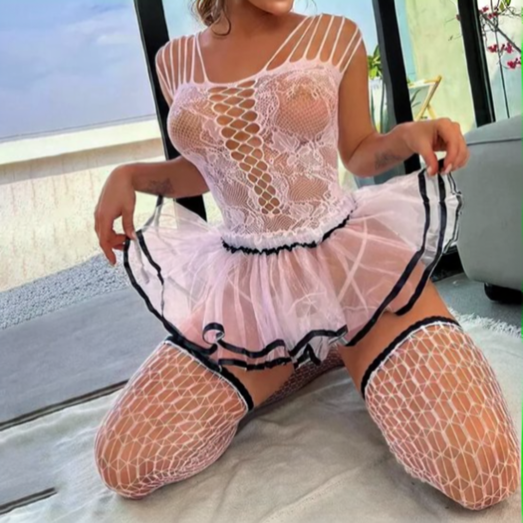 De set bestaat uit een verleidelijke lingeriejurk en bijpassende kousen, die je lichaam omhullen in sensuele transparantie en je natuurlijke schoonheid accentueren. Het zwart-witte contrast voegt een vleugje mysterie toe, terwijl de transparante stof subtiel de contouren van je lichaam onthult, waardoor je partner betoverd wordt door je schoonheid.