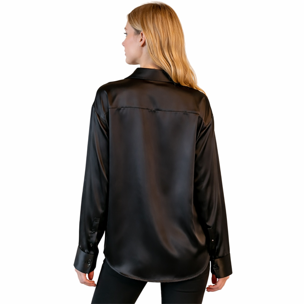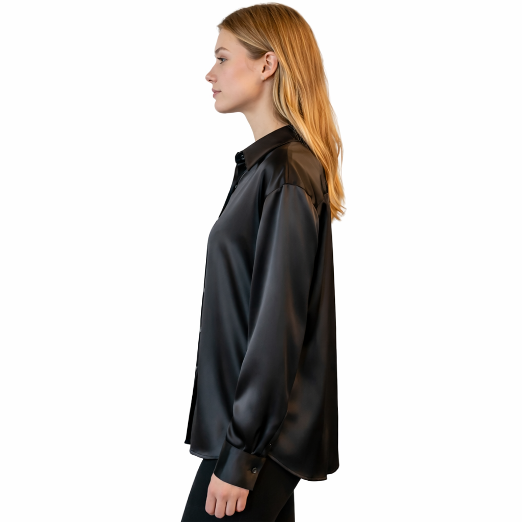 Deze elegante damesblouse in glimmend zwart heeft een luxe en moderne uitstraling. Het soepele, licht glanzende materiaal valt mooi om het lichaam en zorgt voor een verfijnde look. De blouse is voorzien van lange mouwen, een klassieke kraag en een knoopsluiting aan de voorzijde. Perfect voor kantoor, avondgelegenheden of een stijlvolle dagelijkse outfit. Eenvoudig te combineren met zowel formele als casual kledingstukken.