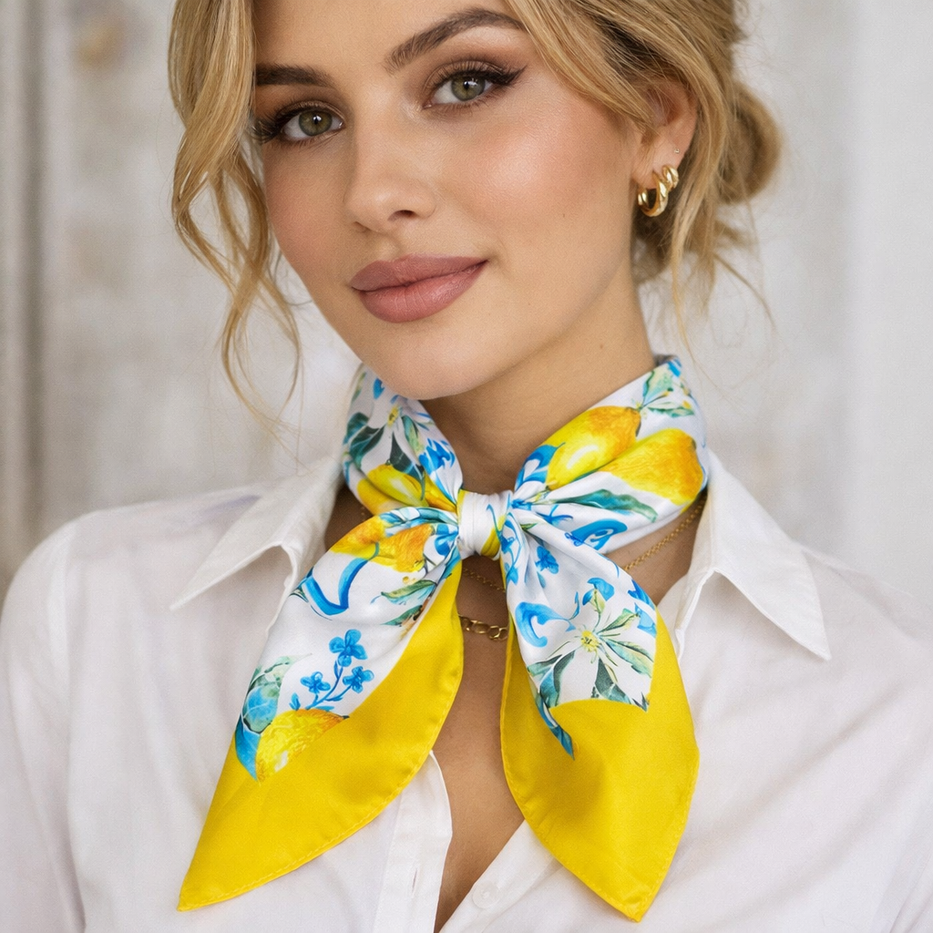 Deze stijlvolle zijden sjaal is een echte blikvanger. Gemaakt van zachte, glanzende zijde voelt hij luxueus aan op de huid en voegt hij moeiteloos een vleugje klasse toe aan elke outfit. Het vierkante formaat van 70×70 cm maakt hem veelzijdig in gebruik – draag hem als bandana, om je hals, in je haar of elegant aan je handtas geknoopt.