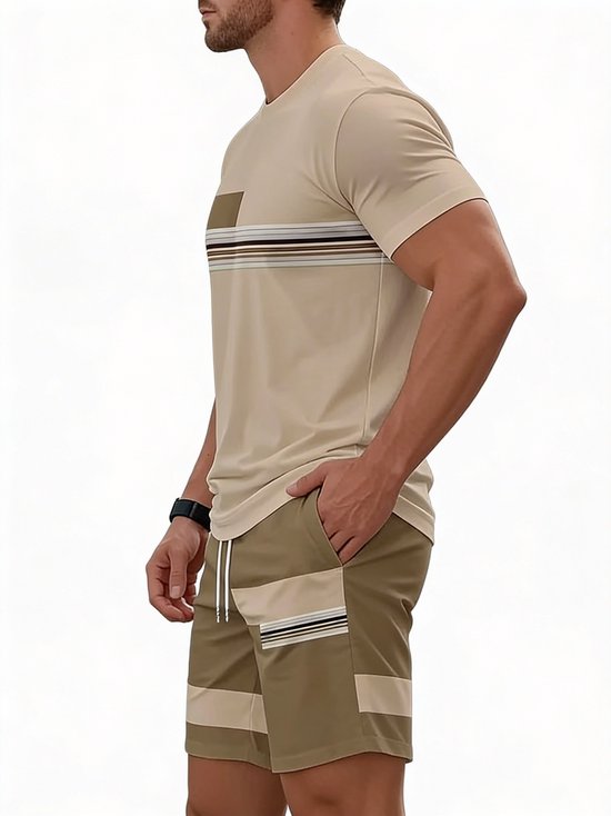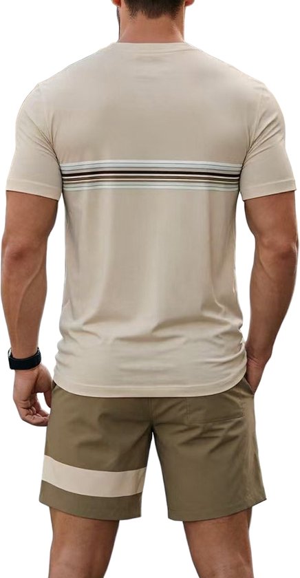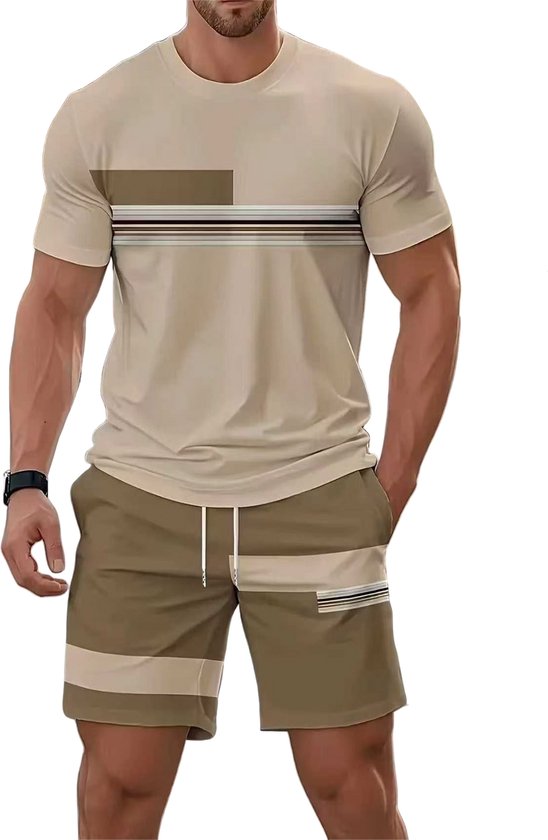 Deze moderne herenset bestaat uit een lichtgewicht T-shirt en bijpassende shorts, ontworpen voor mannen die stijl en comfort willen combineren. De set heeft een eigentijdse uitstraling met subtiele strepen en een perfecte pasvorm, waardoor je er moeiteloos verzorgd uitziet, of je nu naar het strand gaat, een wandeling maakt of gewoon ontspant.