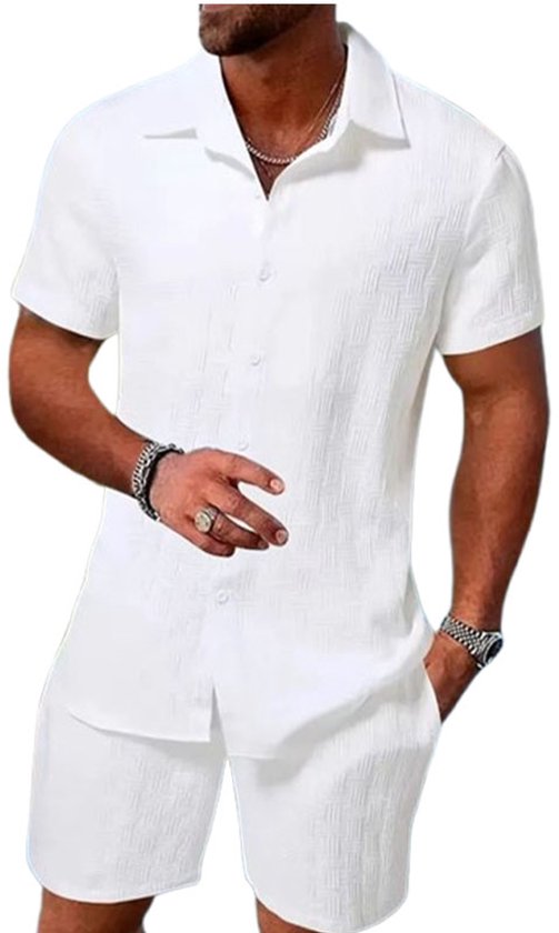 Stijlvol wit zomersetje voor heren met korte mouwen en korte broek, afgewerkt met een subtiel ingeweven patroon. Gemaakt van licht en ademend materiaal, ideaal voor warme dagen of vakantie. Perfect voor een casual, trendy of zomerse look.