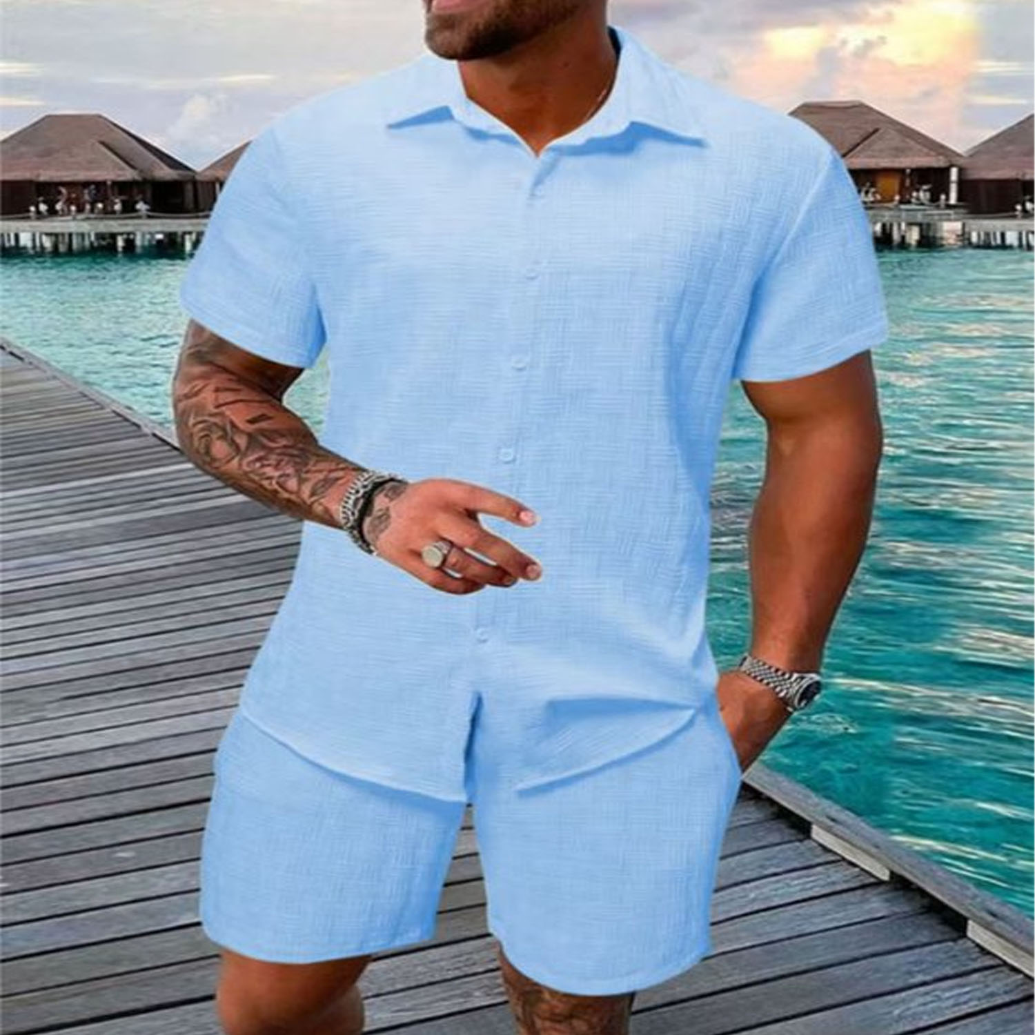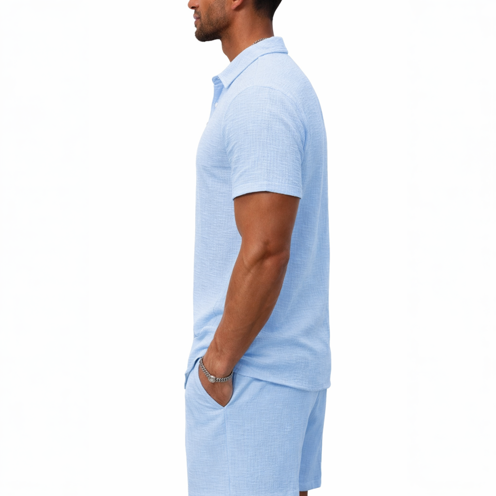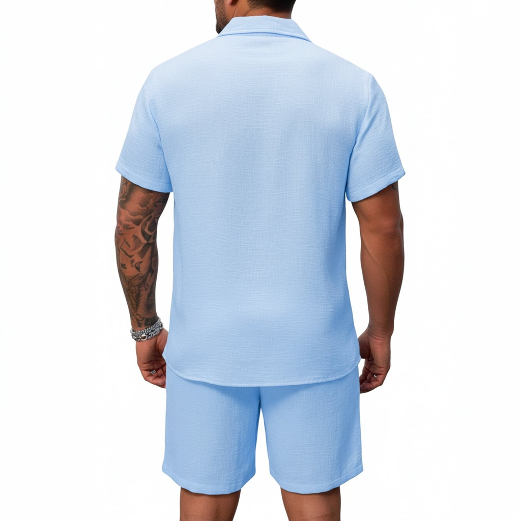 Deze zomerset voor heren biedt een perfecte combinatie van stijl en comfort. De set bestaat uit een lichtblauwe blouse met korte mouwen en een bijpassende korte broek. De blouse heeft een relaxte pasvorm en een open kraag voor een nonchalante look. De korte broek is voorzien van een elastische tailleband voor extra draaggemak. Gemaakt van ademende en zachte stof die ideaal is voor warme dagen. Of je nu op vakantie bent, een strandwandeling maakt of een zomers feest bijwoont, deze set laat je er moeiteloos verzorgd uitzien. Combineer met sneakers of slippers voor een complete look.