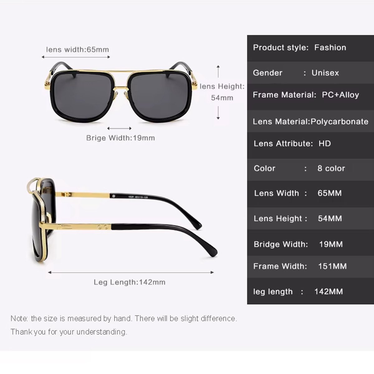 Deze zonnebril combineert een stevig PC-alloy frame met hoogwaardige HD polycarbonaat lenzen voor helder zicht en extra slagvastheid. Het vierkante montuur krijgt door de dubbele brug een uitgesproken, eigentijdse uitstraling. Verstelbare neussteuntjes en flexibele pootjes zorgen voor een persoonlijke pasvorm zonder drukpunten. Met de lensbreedte van 65 mm en brug van 19 mm sluit hij goed aan bij uiteenlopende gelaatsvormen. Dankzij de 142 mm lange pootjes blijft de bril stabiel zitten, ook bij beweging.