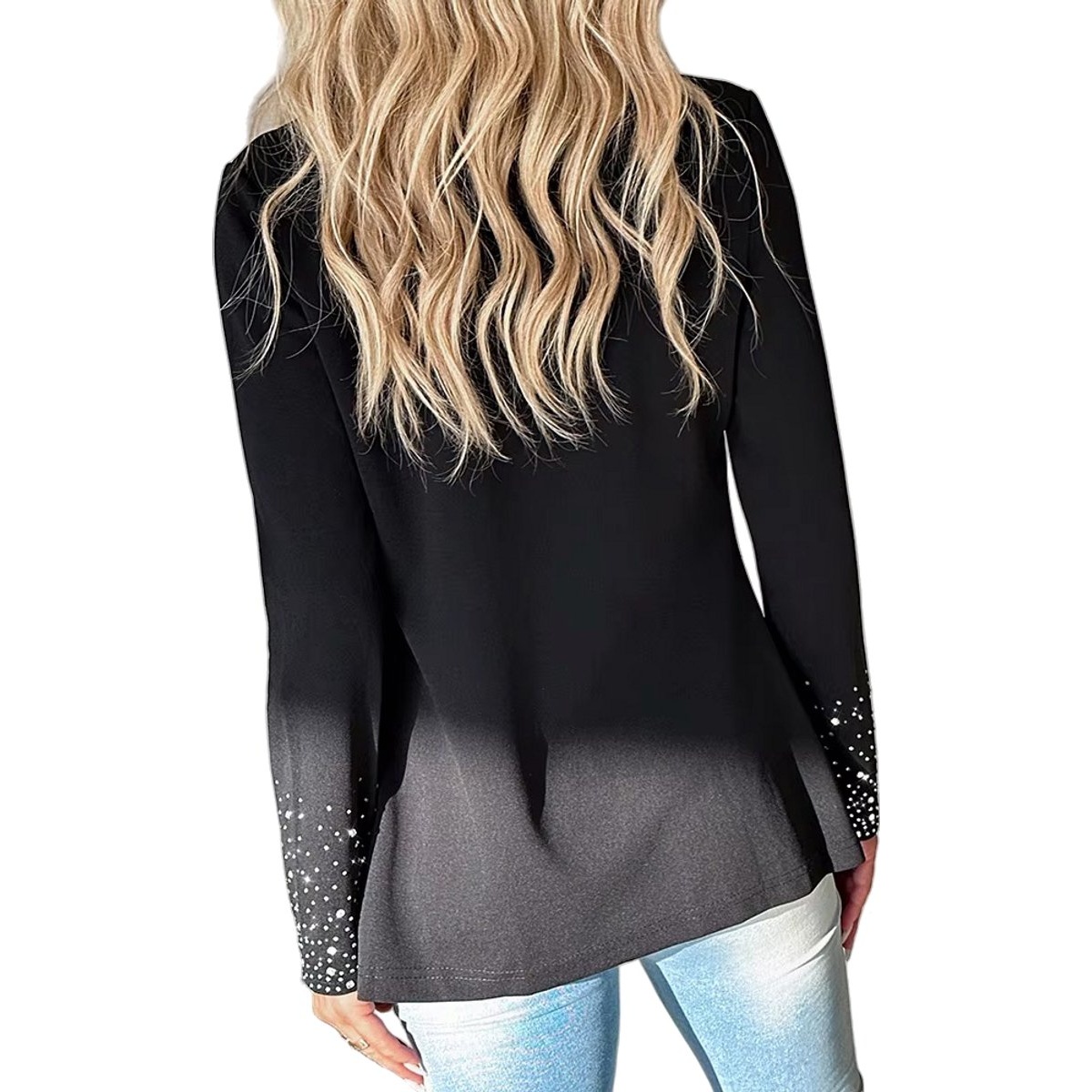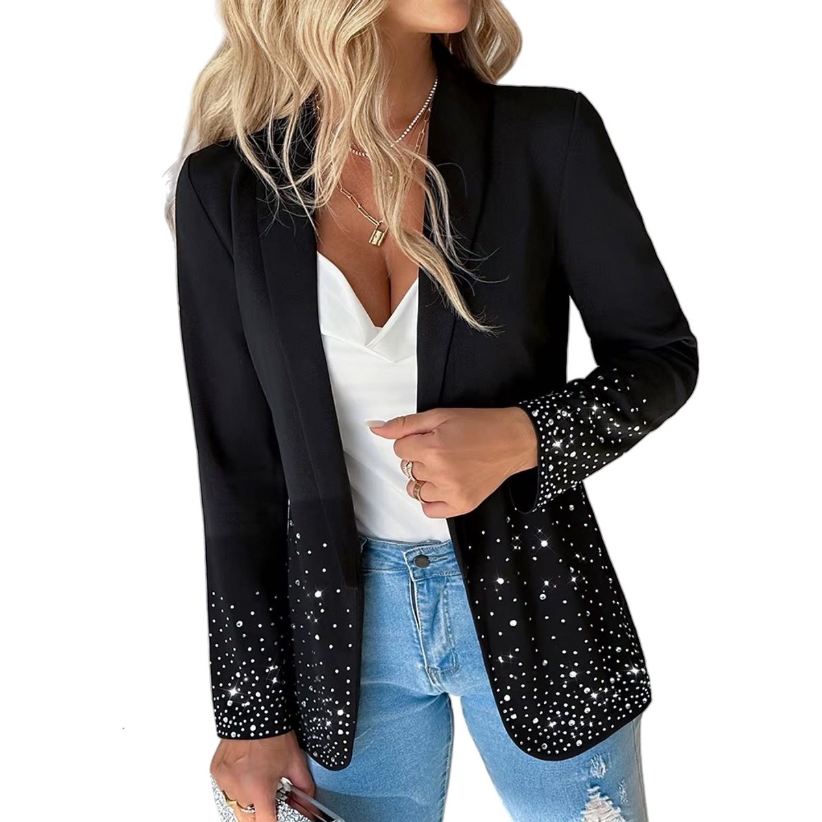 Deze stijlvolle zwarte blazer is afgewerkt met schitterende strasssteentjes langs de mouwen en zakken voor een luxueuze uitstraling. Het tijdloze design past perfect bij zowel casual als elegante outfits. Gemaakt van comfortabel, licht materiaal dat mooi valt. Combineer hem met een jeans voor een trendy look of met een rok voor een feestelijke uitstraling. De blazer heeft een open voorkant zonder sluiting, wat zorgt voor een moderne en vrouwelijke pasvorm. Ideaal voor feesten, diners of als statement piece in je garderobe.